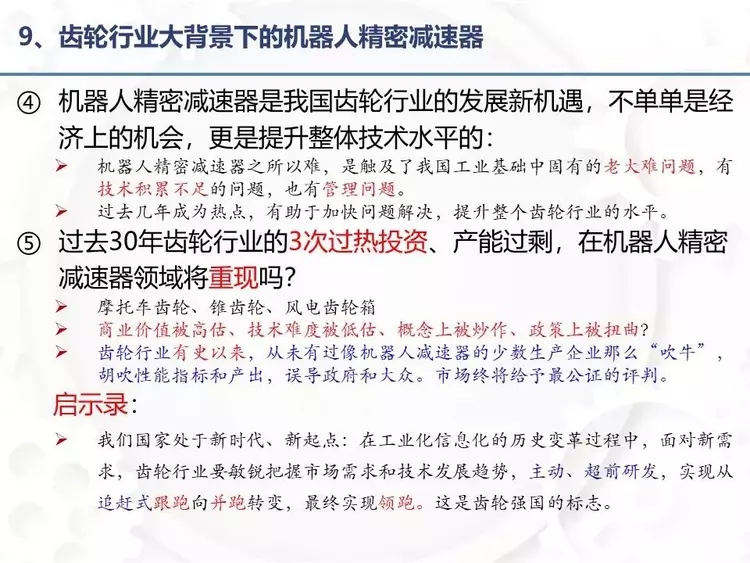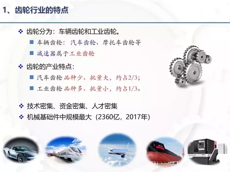 我們先從齒輪行業的大背景下來看精密減速器。齒輪行業在零部件里是最大的行業,有自身的發展規律和技術進展節拍。先給大家普及一下齒輪行業的概念,齒輪就分兩種,我們書上講很多,齒輪就是兩種,工業齒輪和車輛齒輪,齒輪行業的特點可以總結為以下這些: