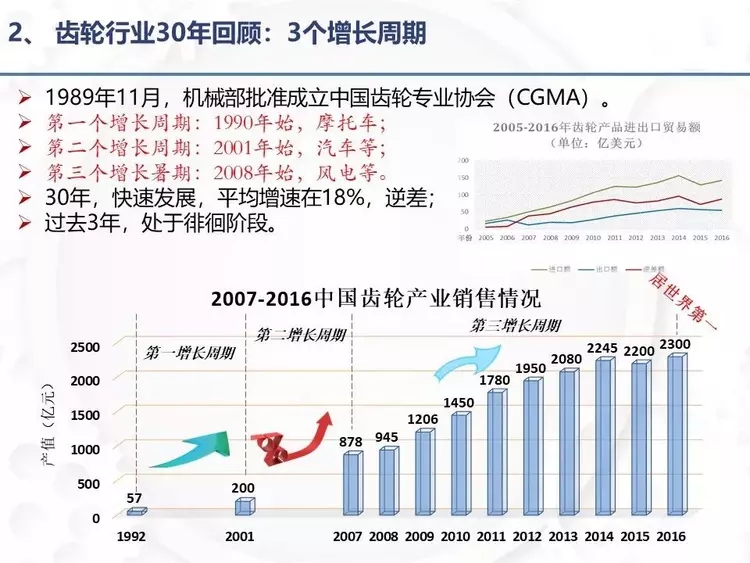 機械零部件有很多種,如軸承、緊固件、模具等等,但齒輪行業的產值是最大的,2017年達2360億,軸承只有1800多億。過去30年,中國齒輪行業經歷了3個增長周期,總體上30年來齒輪行業都增長很快,但是2014、2015、2016徘徊了三年。齒輪行業還有一個特點,在中國制造走向世界過程中,齒輪行業體現的是逆差,這點我后面再講。