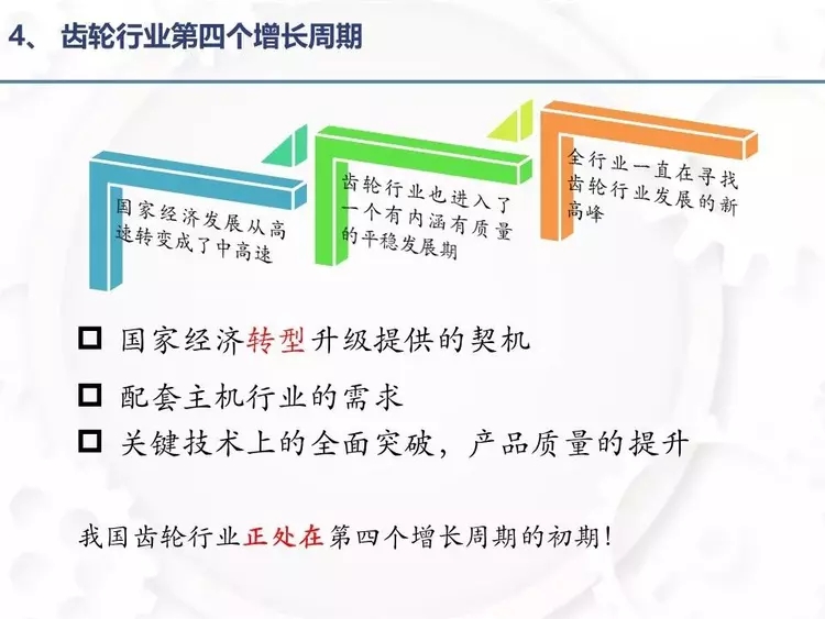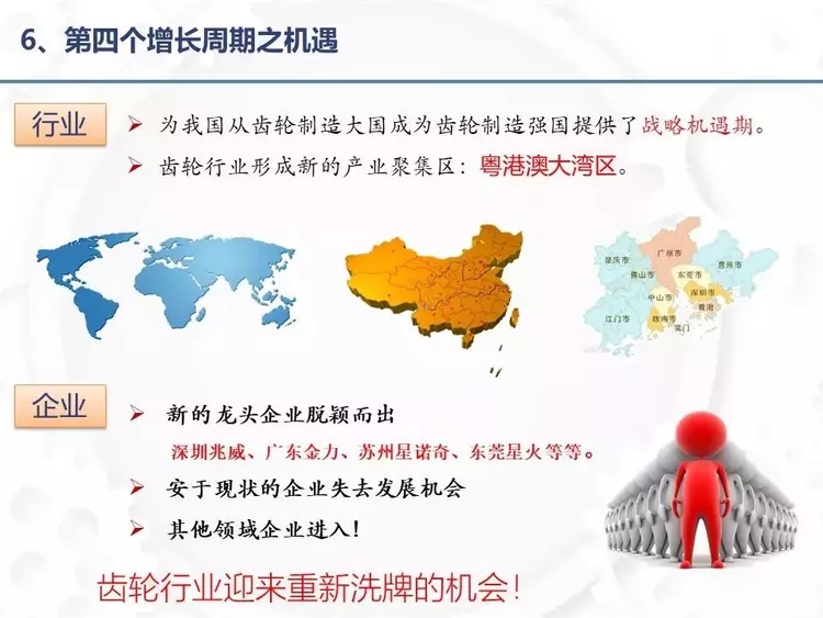 第四次增長給大家帶來了新的機會,我國也將從齒輪大國成長為齒輪強國,將形成新的產業聚集區。對企業來說,是一個重新洗牌的機會,很多龍頭企業會脫穎而出。