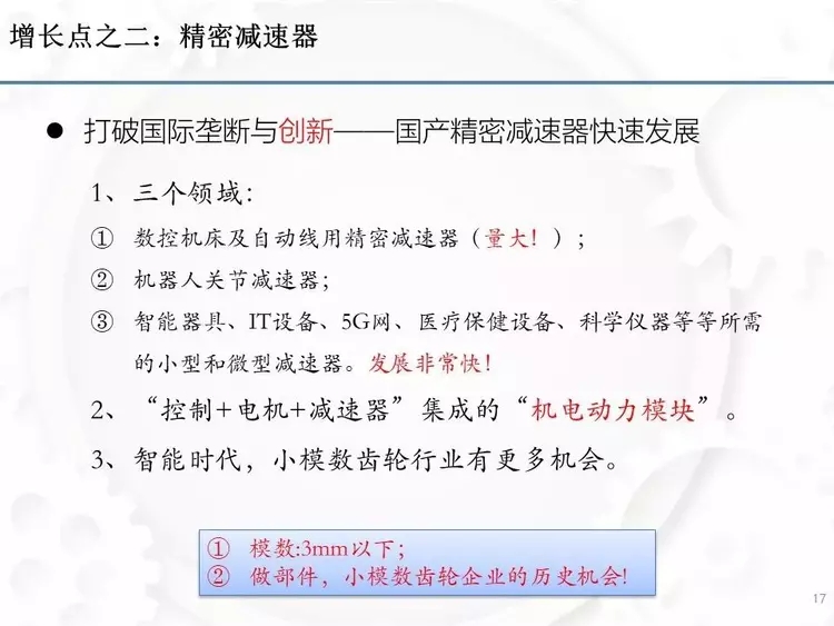 增長點之二就是精密減速器,涉及面很寬。數控機床曾經連齒輪都沒有更別說減速器了,現在高檔數控機床都帶有精密減速器,因為添加減速器能提高整個機床的動態性能。此外自動化生產線對減速器的需求也很大。這個市場國內發展很快,空白點也很多,現在成規模進口;再一個是機器人的關節減速器;還有智能器具和IT設備對精密減速器的需求,也是風投最熱的一塊。比如全屏手機的鏡頭,就是由微小減速器驅動彈出的,各種密碼鎖也對減速器有巨量需求;值得特別關注的是:“控制+電機+減速器”集成為“機電動力模塊”將是未來增長最快的。