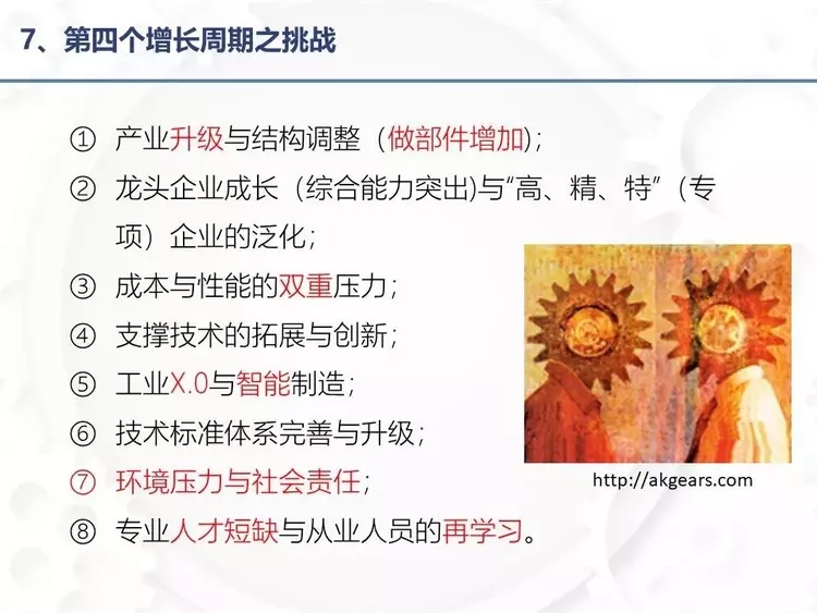 那么第四次增長有什么特點呢?前三次基本上是引進、消化、再創新,現在減速器技術只能靠自己研發了。第四次增長的特點,一是自有技術,二是綜合性。在座的很多搞研究的,這是一個很好的機會,減速器行業的專家收入都很高,這個領域的機會還是蠻多的。綜合性體現在技術、裝備、人才、管理等多個方面,而不是依靠單要素的。