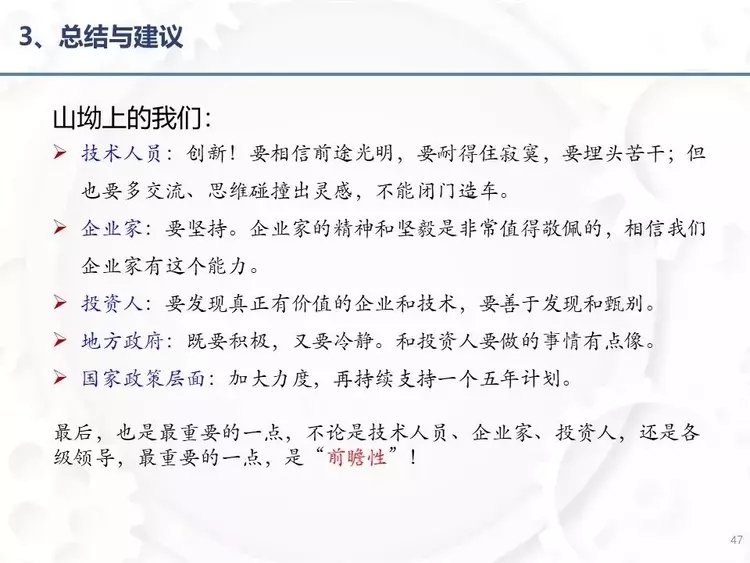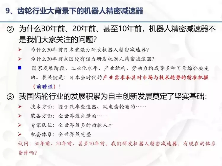 想想這個問題,為什么30年前,1980年代,我們沒有和日本同時開始下功夫研究機器人精密減速器?說白了我們還是沒有這個產業需求,10年前中國的勞動力還沒有這么貴,我們沒有前瞻性?,F在實際上整個行業在補課,補20年前、30年前的課,我們研究的產業的、風投的等等,都是在補課。