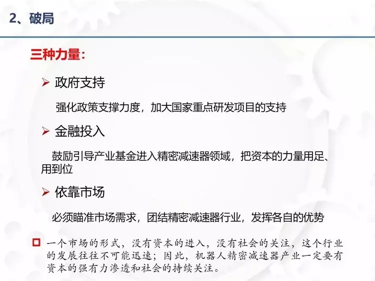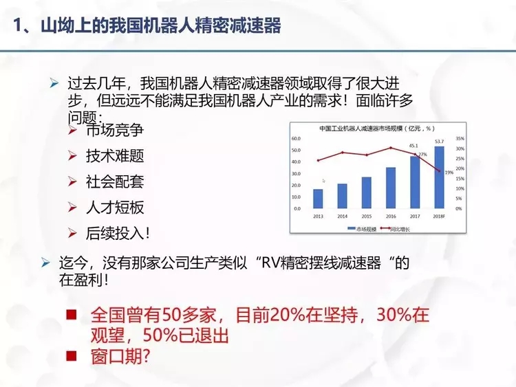 下面我講問題和對策,主要是講一些共性問題。潮起潮落一批企業退出去了,這很正常,近來機器人精密減速器的投入在下降,是回歸到理性了嗎?已經走過了喊口號的階段了,現在很多企業是實實在在干活,大浪淘沙留下來的才是金。