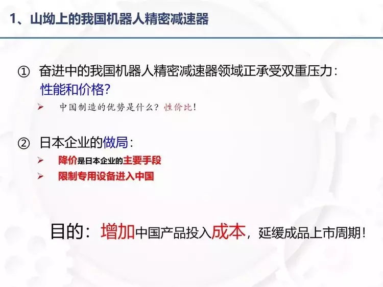 現在機器人精密減速器行業處在雙重壓力之中。感覺日本人在給我們做“局”,知道中國的東西快出來了,就開始降價,你做的成本比他的銷售價還高,讓你沒辦法賣出去,憋得你很難受。第二個是限制相關專用設備進入中國,逼你中國買價格昂貴多的瑞士和德國設備,就是加大你投入成本,讓你成本下不來,延遲你產品上市。