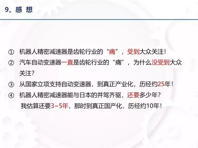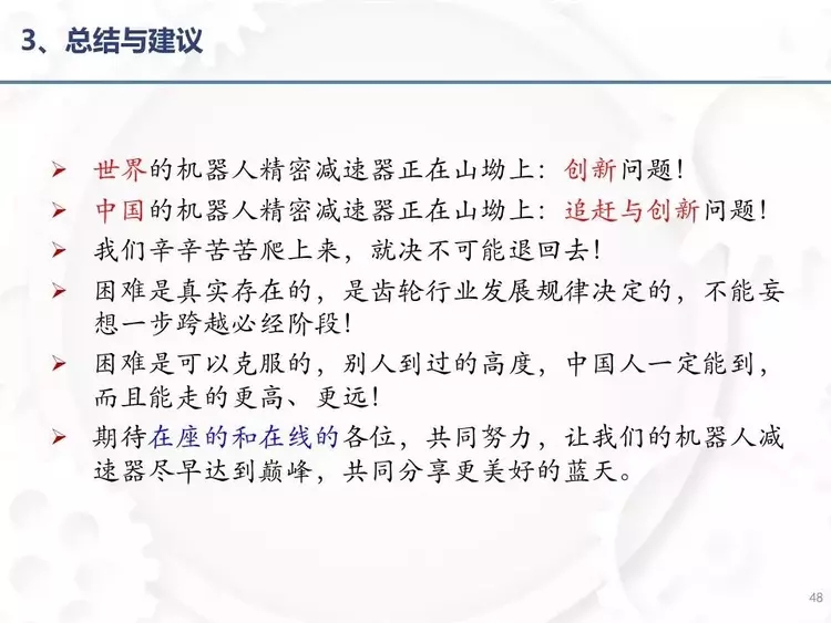 世界的機器人精密減速器正在山坳上,是創新問題。中國的機器人精密減速器正在山坳上,是追趕與創新問題。我們辛辛苦苦爬到這里,是退不回去了。困難是真實存在,是齒輪行業發展規律決定,我們不要妄想一步跨越必經階段,不管怎么樣人家到過的高度中國人一定能到,讓我們在座的各位一起努力,讓我們的機器人減速器盡早達到最高的巔峰。謝謝!