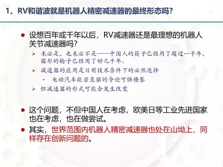 這段話是我寫的:10年以后、100年以后,1000年以后RV還是不是最理想的關節減速器,RV減速器以后,是不是機器人最終的形態?就像筷子一樣,筷子一千多年前就有了,還是兩根棍子。我感覺到減速器現在這種形態肯定是要改變的,它本身存在著一些問題,那么復雜,要求那么高,帶來了方方面面的問題,說不定哪天一個前瞻的出現把這些東西都改變了。