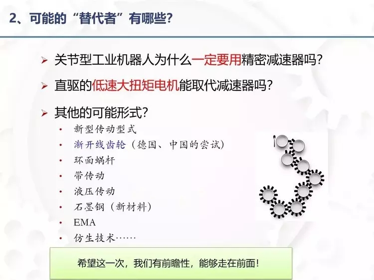 工業機器人就一定要有減速器嗎?這個問題我們在國內爭論了好久,到底為什么一定要用?現在的結論是,工業機器人減速器其實是不可替代的,在目前階段。所以現在很多人在探討這個問題。
