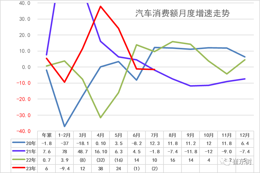 7月份,社會消費品零售總額36761億元,同比增長2.5%。其中,汽車消費品下降2%。除汽車以外的消費品零售額32906億元,增長3.0%。