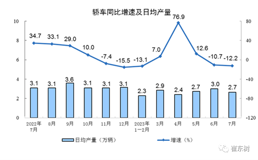 分產品看, 7月份,汽車日均7.5萬輛,降3.8%,考慮到2022年7月高基數效應,今年增速高的表現是很不錯的。