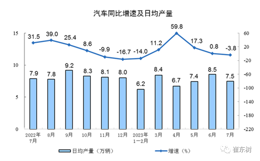 1—7月份,規模以上工業增加值同比增長3.8%,其中汽車增加值增12%。7月份,41個大類行業中有23個行業增加值保持同比增長,其中汽車制造業增長6.2%。