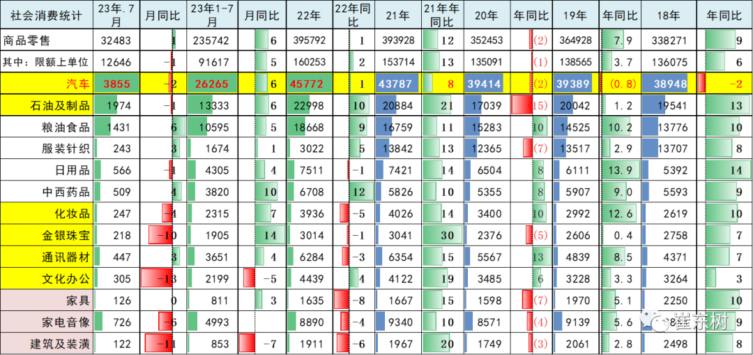 1—7月份,社會消費品零售總額264348億元,同比增長7.3%。其中,除汽車以外的消費品零售額238083億元,增長7.5%。汽車消費品零售額235742億元,增6%。