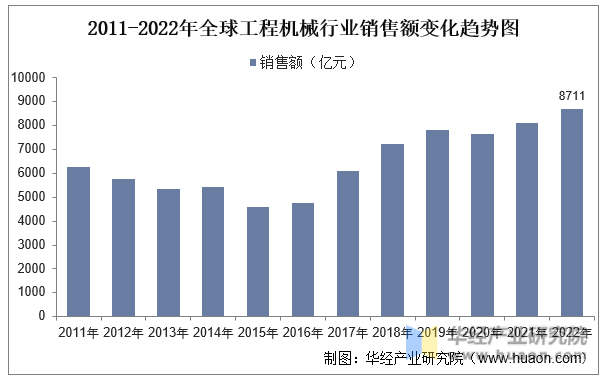 華經(jīng)產(chǎn)業(yè)研究院有針對(duì)工程機(jī)械行業(yè)的分析報(bào)告顯示,2021年全球工程機(jī)械總銷售額突破8000億元。2022年銷售額維持高增速,達(dá)到8710.9億元,同比增長7.7%。2022年全球工程機(jī)械銷售金額達(dá)新高,2011-2022年期間復(fù)合年增長率為3.05%。分區(qū)域來看,北美為全球第一大市場且保持高增,歐洲、新興市場國家需求同樣較為旺盛。
