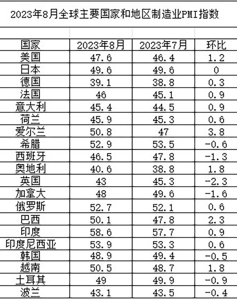2023年8月份,亞洲制造業PMI為50.7%,較上月上升0.2個百分點,連續2個月環比上升,連續8個月在50%以上,顯示亞洲制造業延續平穩增長趨勢。從主要國家看,中國制造業PMI雖仍在50%以下(49.7%),但連續3個月上升,向好回升勢頭進一步鞏固;印度制造業保持強勁增長,制造業PMI較上月上升,且在58%以上;從東盟主要國家看,印尼制造業保持較快增長,PMI保持在53%以上,越南制造業結束連續5個月50%以下走勢,升至50.5%;韓國和日本制造業PMI較上月一平一降,均在50%以下。