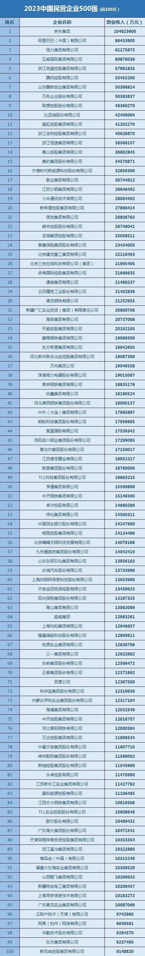 全國工商聯9月12日發布2023中國民營企業500強榜單和《2023中國民營企業500強調研分析報告》。京東集團、阿里巴巴(中國)有限公司、恒力集團有限公司位居榜單前三位。