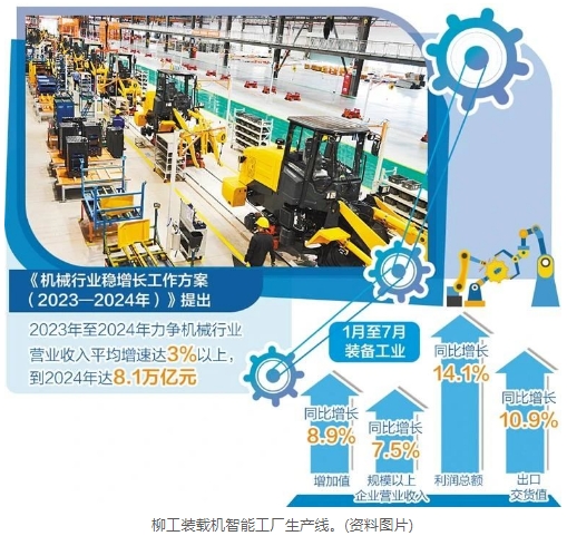 龍頭企業高速增長,背后是裝備工業整體向好。一是裝備工業生產快速回升。根據國家統計局數據,今年1月至7月,裝備工業增加值同比增長8.9%,高于規模以上工業5.1個百分點,對工業增長拉動作用明顯;二是企業效益持續提升,1月至7月,裝備工業規模以上企業營業收入和利潤總額分別同比增長7.5%和14.1%,高于規模以上工業8個和29.6個百分點;三是出口保持平穩增長,出口交貨值同比增長10.9%,高于規模以上工業15.8個百分點。