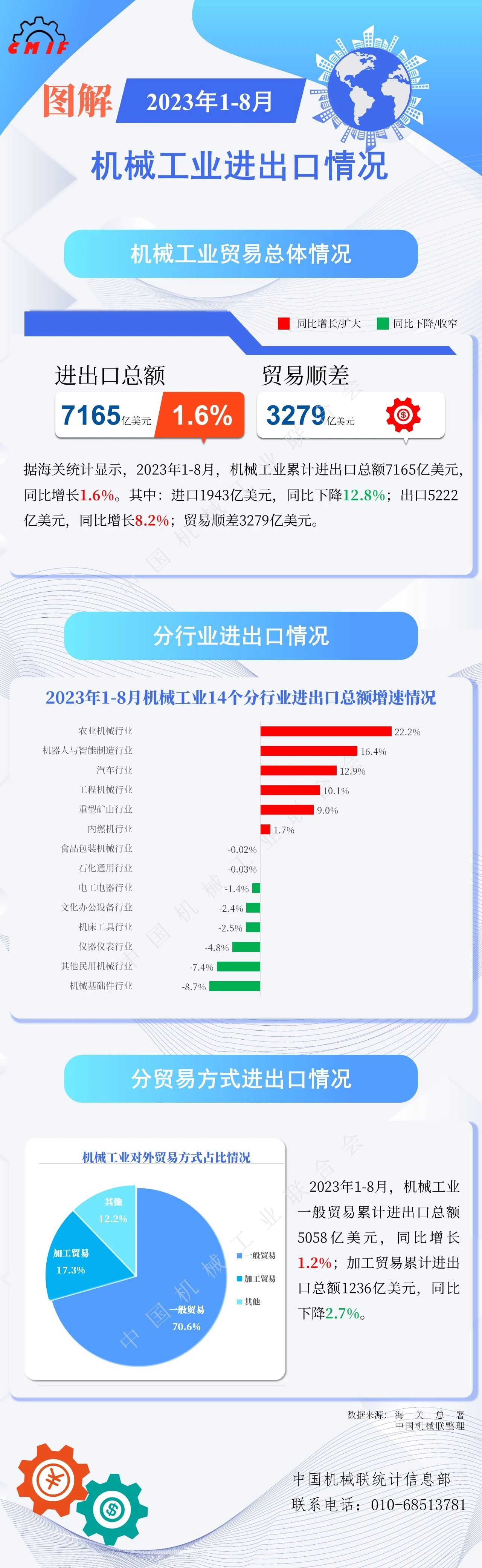 據(jù)海關(guān)統(tǒng)計(jì)顯示,2023年1-8月,機(jī)械工業(yè)累計(jì)進(jìn)出口總額7165億美元,同比增長(zhǎng)1.6%。