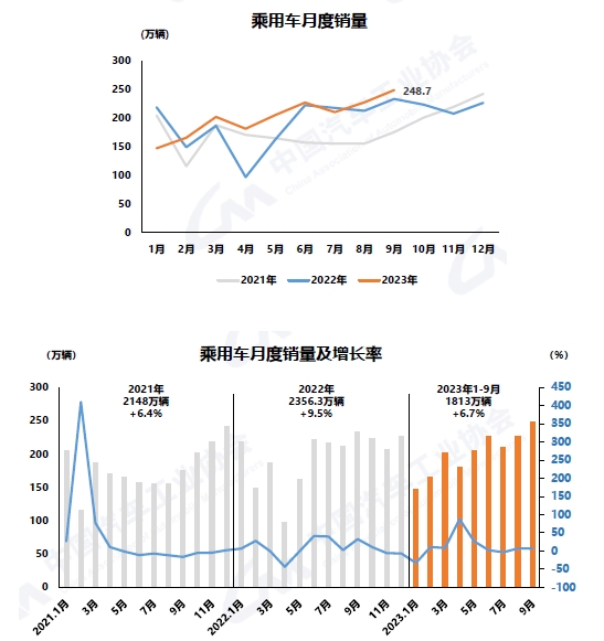 9月,乘用車產銷分別完成249.6萬輛和248.7萬輛,環比分別增長9.7%和9.4%,同比分別增長3.5%和6.6%。在乘用車主要品種中,與上月相比,四大類車型產銷均呈不同程度增長;與上年同期相比,運動型多用途乘用車(SUV)產銷呈兩位數增長,多功能乘用車(MPV)產量下降、銷量增長,基本型乘用車(轎車)和交叉型乘用車產銷呈不同程度下降。
