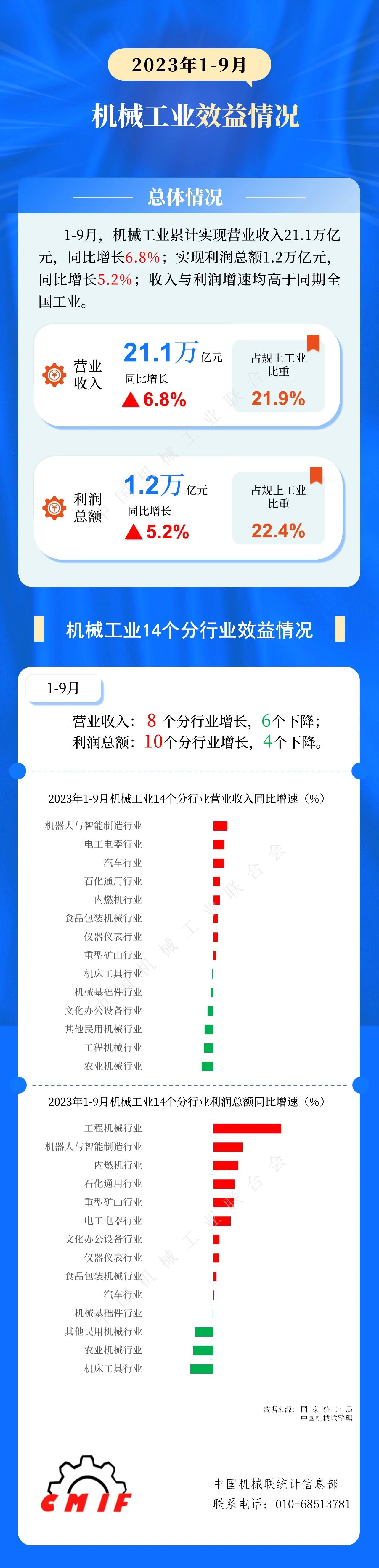 1-9月,機械工業(yè)累計實現(xiàn)營業(yè)收入21.1萬億元,同比增長6.8%;實現(xiàn)利潤總額1.2萬億元,同比增長5.2%;收入與利潤增速均高于同期全國工業(yè)。