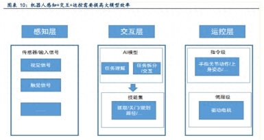 任務級交互+時效性是機器人控制難點。一般而言,機器人在執行任務的時候,需要通過傳感器去感知周邊環境情況,收集圖像、語音信息,之后通過自身處理器和 AI 大模型去理解任務,再將任務拆分成可以執行的步驟。機器人本身通過機器訓練等具有一定技能集合,這些可執行 步驟經由機器人具體執行,轉換為各個部件傳統運控系統可執行的信號。但這些任務級交互需要較高的 AI 大模型決策能力和理解能力;同時,對任務拆解-運控規劃的時效性也具有一定要求,需要機器人與環境交互時更快、更精確地執行任務,這意味著大模型效率需要進一步提升。