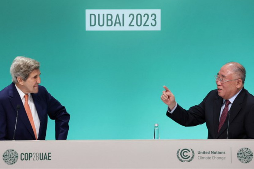 圖說:美國首席氣候談判代表克里與中國氣候變化事務特使解振華在COP28期間溝通