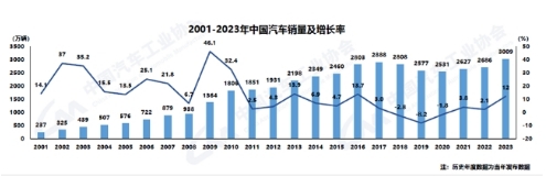 中汽協(xié)數(shù)據(jù)顯示,我國汽車產(chǎn)銷總量連續(xù)15年穩(wěn)居全球第一。2009年,中國汽車產(chǎn)銷量首次雙突破1000萬輛大關(guān),成為世界汽車產(chǎn)銷第一大國。2013年突破2000萬輛,2017年產(chǎn)銷量達(dá)到階段峰值,隨后市場連續(xù)三年下降,進(jìn)入轉(zhuǎn)型調(diào)整期,2021年結(jié)束“三連降”開始回升。2023年,汽車產(chǎn)銷累計(jì)完成3016.1萬輛和3009.4萬輛,同比分別增長11.6%和12%。