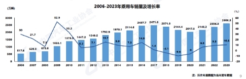 2023年,乘用車產(chǎn)銷累計(jì)完成2612.4萬輛和2606.3萬輛,同比分別增長9.6%和10.6%,乘用車?yán)塾?jì)產(chǎn)銷量均創(chuàng)歷史新高。在乘用車主要品種中,與上一年度相比,運(yùn)動(dòng)型多用途乘用車(SUV)和多功能乘用車(MPV)產(chǎn)銷呈兩位數(shù)增長,基本型乘用車(轎車)產(chǎn)銷呈小幅增長,交叉型乘用車產(chǎn)銷呈兩位數(shù)下降。