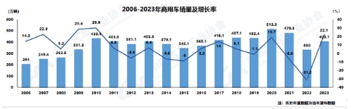 2023年,商用車產(chǎn)銷累計(jì)完成403.7萬輛和403.1萬輛,產(chǎn)銷重回400萬輛,同比分別增長26.8%和22.1%。在商用車主要品種中,與上一年度相比,客車、貨車產(chǎn)銷均呈兩位數(shù)明顯增長。在貨車主要品種中,與上一年度相比,四大類貨車品種產(chǎn)銷均呈兩位數(shù)增長,其中重型貨車產(chǎn)銷增速更為顯著。