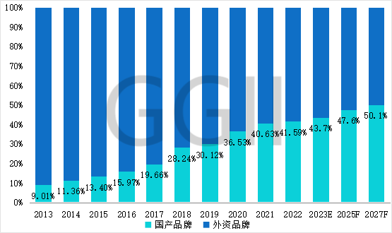這十年來,減速器行業(yè)國(guó)產(chǎn)替代,道阻且長(zhǎng),但我們?nèi)孕栌y而上。GGII預(yù)測(cè),到2027年,減速器領(lǐng)域國(guó)產(chǎn)份額仍將超過50%。