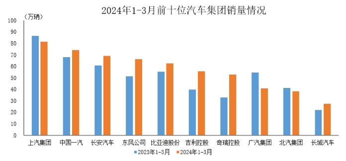 據(jù)中國(guó)汽車工業(yè)協(xié)會(huì)統(tǒng)計(jì)分析,2024年1-3月,汽車銷量排名前十位的企業(yè)(集團(tuán))共銷售568.9萬(wàn)輛,占汽車銷售總量的84.7%。