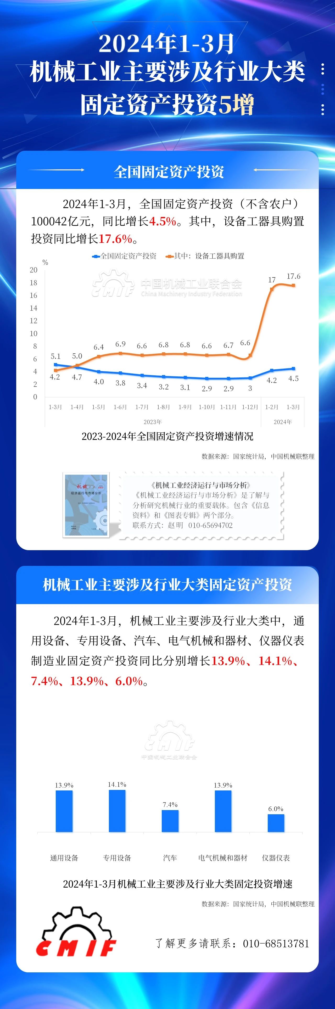 2024年1-3月,全國固定資產投資(不含農戶)100042億元,同比增長4.5%。其中,設備工器具購置投資同比增長17.6%。