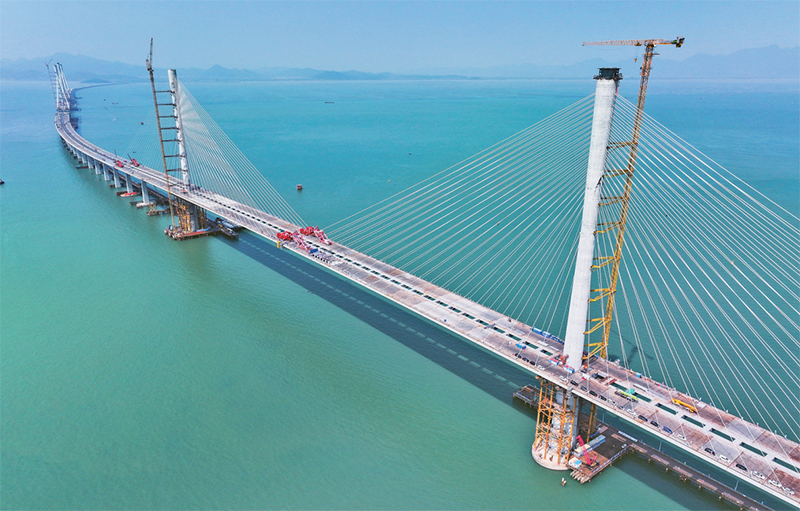 黃茅??绾Mǖ朗腔浉郯拇鬄硡^又一超大型跨海工程,跨海段由高欄港大橋和黃茅海大橋兩座主橋組成,項目建成后將進一步完善大灣區跨??缃ǖ廊海Ω哔|量發展。圖為2024年3月20日,黃茅海跨海通道高欄港大橋合龍梁段。 新華社記者 劉大偉/攝