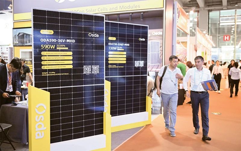 電動汽車、鋰電池和光伏產品被稱為我國外貿“新三樣”。在第135屆廣交會上,“新三樣”相關展區“光電鋰”交易持續火爆。圖為2024年4月15日,境外采購商在廣交會上參觀太陽能電池展臺。 新華社記者 鄧華/攝