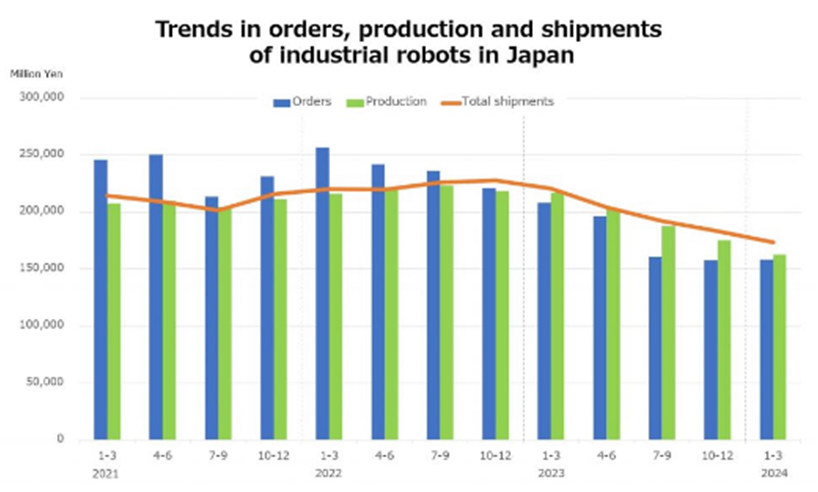 4月25日,日本機器人協會(JARA)公布了2024年前3個月日本工業機器人新訂單和產量方面的會員數據。