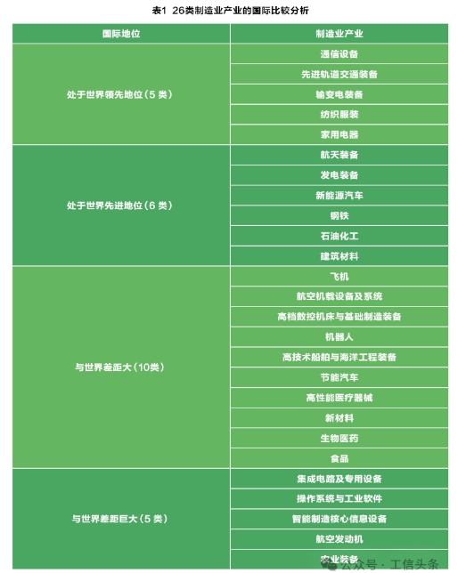 2019 年,中國(guó)工程院出具了一份報(bào)告,報(bào)告對(duì)中國(guó) 26 類具有代表性的制造業(yè)產(chǎn)業(yè)進(jìn)行了國(guó)際比較分析,結(jié)果如下。