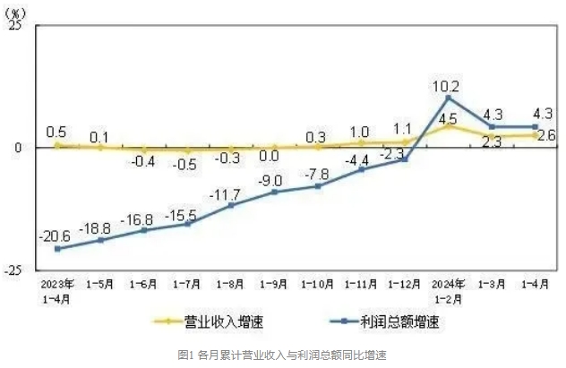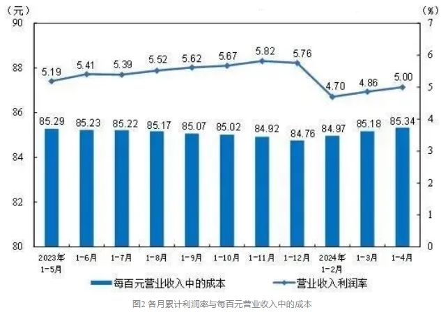 1-4月份,規模以上工業企業實現營業收入41.92萬億元,同比增長2.6%;發生營業成本35.77萬億元,增長2.8%;營業收入利潤率為5.00%,同比提高0.08個百分點。