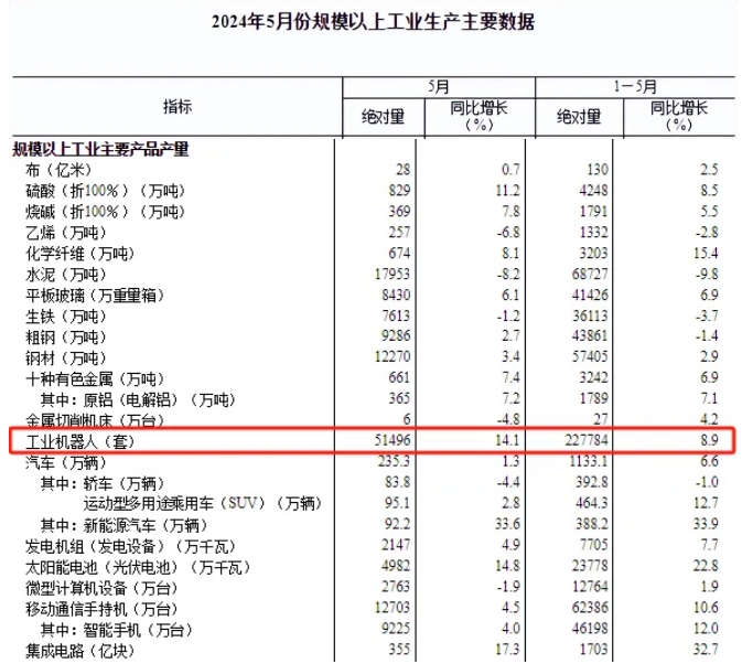 5月份,中國工業機器人產量為51,496套,同比增長14.1%;1-5月,工業機器人產量為227,784套,同比增長8.9%。這或許得益于下游終端應用的需求帶動作用,以及對市場信心的回升。