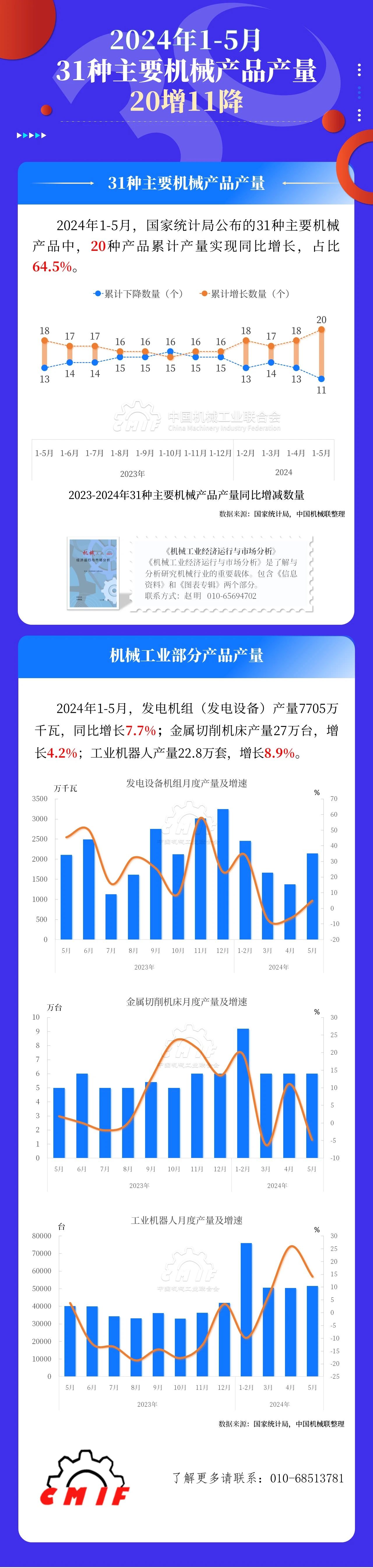 2024年1-5月,國家統計局公布的31種主要機械產品中,20種產品累計產量實現同比增長,占比64.5%。