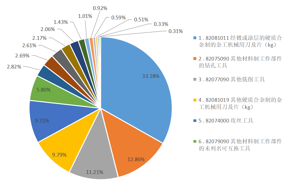 大部分刀具品種出口同比增長,其中,超硬材料制工作部件的鏜孔或鉸孔工具同比增長36.78%,其他銑削工具同比增長17.73%,其他材料制工作部件的未列名可互換工具同比增長17.39%,涂層刀片同比增長8.15%,非涂層刀片同比增長9.03%,鉆頭同比增長9.87%。但絲錐同比下降4.71%。