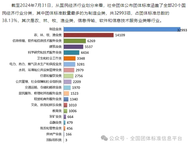 截至2024年7月31日,從國民經濟行業劃分來看,社會團體公布團體標準涵蓋了全部20個國民經濟行業分類,其中團體標準數量最多的為制造業類,共32993項,占團體標準總數的38.13%,其次是農、林、牧、漁業類,信息傳輸、軟件和信息技術服務業類等行業。