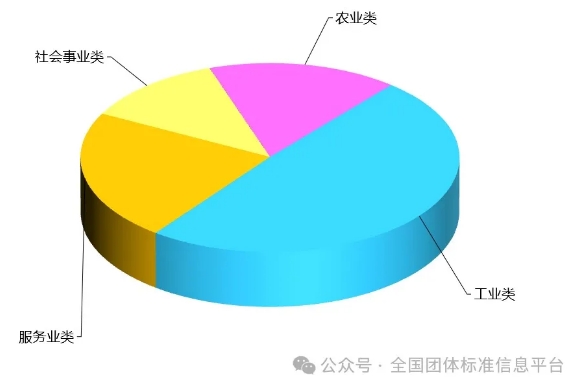 截至2024年7月31日,從產業和社會分布來看,社會團體公布的團體標準中工業類共42506項標準,占比49.12%,服務業類共19352項標準,占比22.36%,農業類共14110項標準,占比16.31%,社會事業類共10564項標準,占比12.21%。