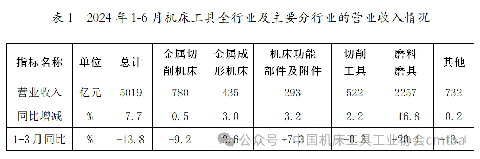 2024年1-6月,機床工具全行業完成營業收入5019億元,同比下降7.7%,降幅較1-3月收窄6.1個百分點。其中,金屬切削機床同比增長0.5%,由1-3月的同比下降轉為增長;金屬成形機床同比增長3.0%,增幅較1-3月擴大0.4個百分點。