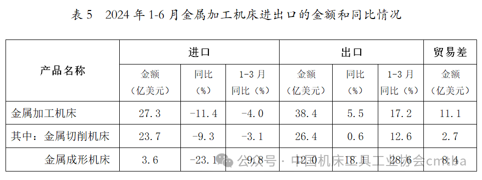 2024年1-6月,金屬加工機床總體進口大幅下降,出口小幅增長,保持貿易順差。與1-3月相比較,進口降幅擴大到兩位數,出口增幅回落至個位數。