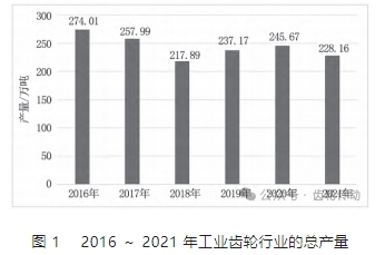 齒輪是指輪緣上有齒,能連續嚙合傳遞運動和動力的機械元件。根據齒輪產品按使用場合可將其分為車輛齒輪、工業齒輪兩類。其中,車輛齒輪約占整個齒輪市場的 62%,而工業齒輪約占整個齒輪市場的 38%。隨著汽車工業、機械制造業和航空航天工業的不斷發展,對齒輪產品的需求也在不斷增加。因此,我國積極生產齒輪產品。不過,在我國去產能、調整產業結構的背景下我國齒輪產品的生產也受到了一定的影響。其中,2016 ~ 2021 年,工業齒輪行業的總產量分別為 274.01 萬噸、257.99 萬噸、217.89 萬噸、237.17 萬噸、245.67 萬噸、 228.16 萬噸(圖 1)。雖說產量受到了影響,但是齒輪行業產值處于增加的狀態。例如,2016 ~ 2020 年,我國齒輪行業產值分別為 2205億元、2360億元、2600億元、2800 億元、3000 億元。也就是說,我國齒輪行業收入規模不斷增長。但是國內市場多數齒輪產品在功率密度、可靠性和使用壽命上與國際先進水平仍存在較大差距。基于此,應當積極探究齒輪制造業發展模式,提高齒輪制造業發展水平,更好地推動齒輪制造業發展。