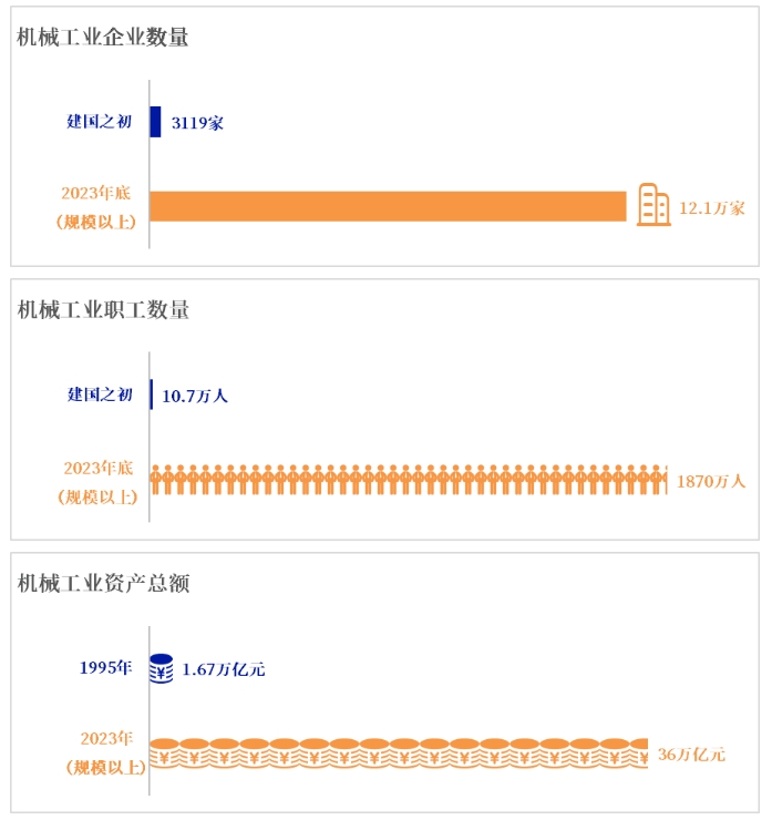 新中國成立之初,機(jī)械工業(yè)企業(yè)數(shù)量為3119家,此后數(shù)量持續(xù)增加,多種所有制經(jīng)濟(jì)共同發(fā)展。截至2023年末,機(jī)械工業(yè)規(guī)模以上企業(yè)(主營業(yè)務(wù)收入2000萬元以上)數(shù)量已達(dá)到12.1萬家,約占全國工業(yè)規(guī)模以上企業(yè)數(shù)量的四分之一。職工人數(shù)由1949年的10.7萬人,增至2023年規(guī)模以上企業(yè)從業(yè)人員約1870萬人,累計(jì)增長174.8倍,占全國工業(yè)職工人數(shù)的24.1%。資產(chǎn)總額由1995年有記錄以來的1.67萬億元,提高至2023年的36萬億元,累計(jì)增長21.6倍,年均增長11.6%。