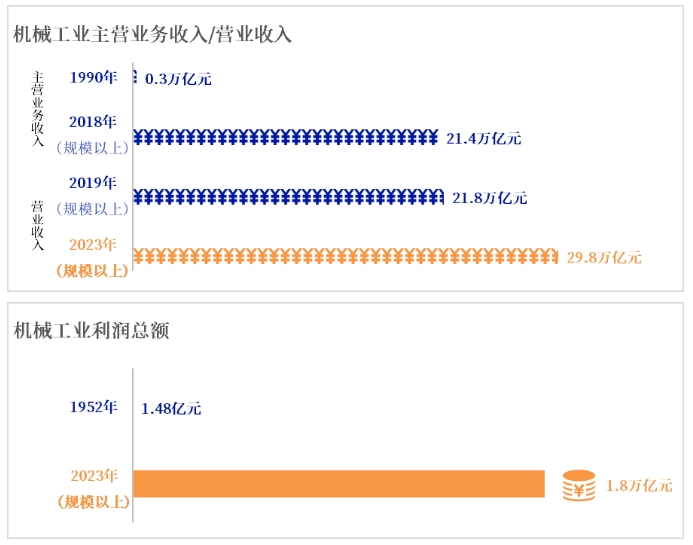 機(jī)械工業(yè)年度主營業(yè)務(wù)收入由1990年的3379.2億元,增至2023年實(shí)現(xiàn)營業(yè)收入29.8萬億元,占全國工業(yè)的22.3%。年度實(shí)現(xiàn)利潤總額,由1952年機(jī)械系統(tǒng)企業(yè)的1.48億元,增至2023年規(guī)模以上企業(yè)合計(jì)的1.8萬億元,占全國工業(yè)的22.8%。