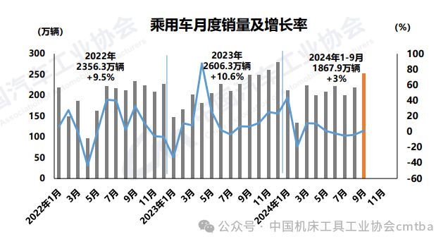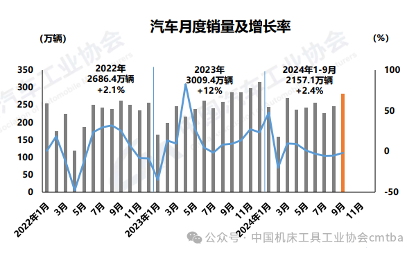9月,汽車產(chǎn)銷分別完成279.6萬輛和280.9萬輛,環(huán)比分別增長12.2%和14.5%,同比分別下降1.9%和1.7%。1-9月,汽車產(chǎn)銷累計(jì)完成2147萬輛和2157.1萬輛,同比分別增長1.9%和2.4%。