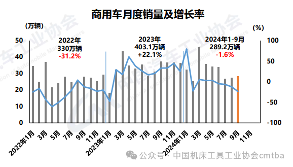 1-9月,商用車產(chǎn)銷累計(jì)完成282.7萬輛和289.2萬輛,同比分別下降2.8%和1.6%。在商用車主要品種中,與上年同期相比,客車產(chǎn)銷呈小幅增長,貨車產(chǎn)銷呈小幅下降。