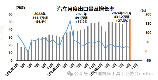 1-9月,汽車出口431.2萬輛,同比增長27.3%。分車型看,乘用車出口363.3萬輛,同比增長28%;商用車出口67.9萬輛,同比增長23.6%。