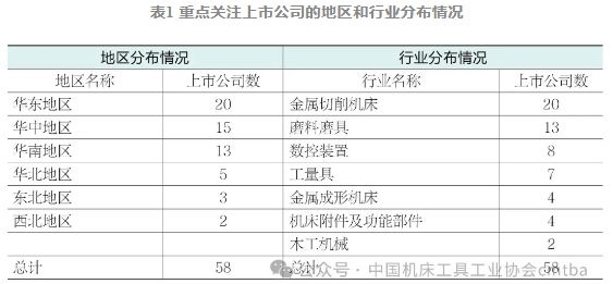 2024上半年中國機床工具工業協會重點關注的上市公司,較2023年新增一家(301603喬鋒智能),減少一家(600243青海華鼎),總數仍為58家,其中深交所主板23家,創業板22家;上交所主板4家,科創板9家。協會重點關注上市公司的具體地區和行業分布情況見表1。
