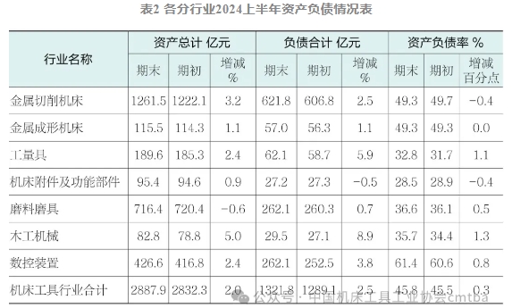 截至2024上半年,行業上市公司的資產總計為2887.9億元,較年初增長2.0%。負債合計為1321.8億元,較年初增長2.5%;其中合同負債為141.5億元,較年初下降5.5%。資產負債率為45.8%,較年初增長0.3個百分點,較年初增長的企業占比51.7%,較年初下降的企業占比占48.3%。總體上負債增長略快于資產增長,資產負債率微增。各分行業2024上半年的資產負債情況見表2。